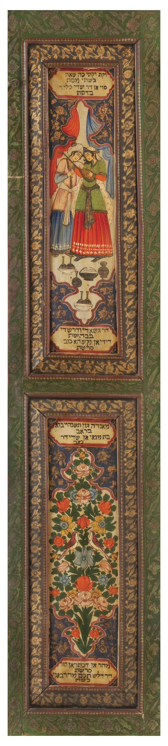 באולם הראשון נמצא בעיקר תשמישי קדושה וכתבי יד מעוטרים, המזכירים מצד אחד תצוגות קלאסיות על יהדות העולם בכלל אך מצד שני מבטאים בצורה ברורה את התרבות הפרסית – תרבות רומנטית השמה דגש רב על שפה מליצית ועל שירה מלאת רגש, והנהנית מעושר אמנותי שפותח שער לעולם המזרח הרחוק. יהדות איראן לא הרבתה לעסוק בהלכה או לחדש בתלמוד, מסביר לי פרופ' דוד ירושלמי בחיוך חם ובמבטא איראני קל; היצירה המאפיינת אותה היא השירה הדתית, שהגיעה לשיאה בימי הביניים המוקדמים. הטקסטים הללו הועברו מדור לדור, והמשיכו להיות מועלים על הכתב בכתבי יד מעוטרים גם מאות שנים אחרי שנכתבו.