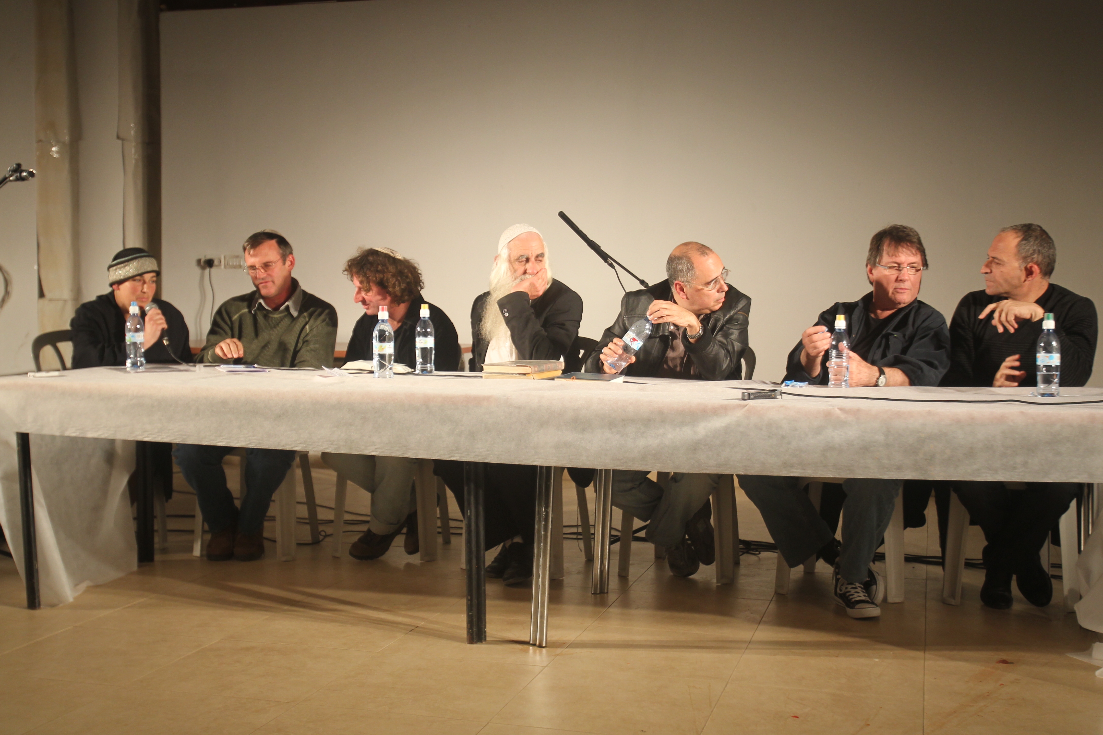 לאחר ההצגה פאנל. על הבמה: תמיר גרינברג, עודד קוטלר, רוני ניניו, הרב מנחם פרומן, אליעז כהן, שאול גולדשטיין ושרה מורלי. כהן, משורר 'משיב הרוח' וממארגני האירוע, פותח: "השיח הערב הוא לא שיח פוליטי. הוא שיח רוחני, הוא שיח של יוצרים, אנשי אמנות, אנשי תיאטרון. שיח מוסרי, שיח אחים". אני רואה איך פיל גדול ולבן הולך ומתמקם במרכז הבמה. פוסע צעד אחר צעד בכבדות, מתרווח. המשתתפים נעים סביבו במגושמות, משתדלים שלא ידרוך עליהם ויקלקל את חליפות החג.