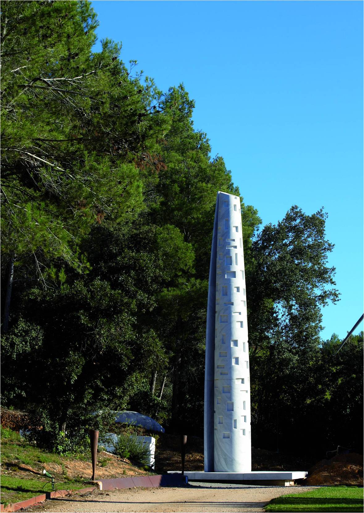 לצידו עומד "מגדל בבל" העוצמתי, עשוי שיש קררה מבהיק בלובנו ומתנשא לגובה של 12 מטרים. לובנו הבוהק של מגדל בבל וחלונותיו המסוגננים יוצרים תחושה של ניכור. אלברז ביקש לרמוז לאדריכלות המודרנית של גורדי השחקים, ולתהות האם התרבות המוכרת לנו כיום היא התרסה כנגד הא-ל; האם גורדי השחקים מסמנים את קיצה של תרבות זו, והאם היות הארץ "שפה אחת ודברים אחדים" היא למעשה שיקוף של הגלובליזציה.