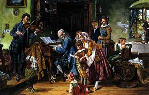 על פני כל איזור טורינגיה בגרמניה היו פזורים משך שנים בני משפחת באך, שכולם זמרים, נגני עוגב, חליל או כינור, ויוהאן סבסטיאן נולד לתוך האטמוספירה המוסיקלית הזאת. אביו יוהאן אמברוזיוס – איש מוסיקלי ובעל שם באייזנאך – לימדו כינור, והילד הפעוט הפליא בנגינה. "למשפחת באך", התגאה האב, "ניתוסף מוסיקאי". בגיל עשר בלבד איבד את הוריו וגודל על ידי אחיו הגדול, נגן עוגב מקצועי בכנסיית אורדורף, שלימד את הנער נגינה וכנראה שלא בחמלה גדולה – כשהוא תולה בו את האשמה על שנאלץ לכלכל עוד נפש אחת. באחד הימים שב האח עם ספר עבה ובתוכו תווי מוסיקה כנסייתית של מיטב הקומפוזיטורים של זמנו. את באך הצעיר הדיר ממנו בטענה שהספר מורכב מדי עבורו. הנער היה מחכה שישקע אחיו בשינה ואז מעתיק את המוסיקה כשנגה הירח בלבד מאיר את חדרו. כך לילה לילה משך שישה חודשים, עד שגילה אחיו וקרע ממנו את המחברת.