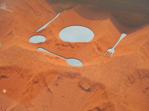 "ארוחת ערב שולחן חול" שבו שקערוריות של צלחות וסכו"ם המטילות צלליות על הרצפה היא עבודה עשויה בחול חמרה אדמדם, שיופיה הופך אותה לשיר הלל ליום-יום, כמו גם להתפעלות מביטוי "האין". בעזרת האור והצל הוא מנכיח צלחות וסכו"ם שאינם, מגלה את "המילים הנאמרות/נרמזות" בעזרת "שפת שולחן", והופך את העבודה למרגשת ומפעימה.
