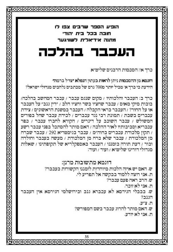 אחד הדברים האהובים ברחוב החרדי, במיוחד על מחברי ספרים בפועל או בפוטנציה, הוא הצפת 'גדולים' בשאלות משאלות שונות. שואלים על כל דבר שזז או לא זז, מן הגורן ומן היקב, מן הארז אשר בלבנון עד האזוב אשר יוצא בקיר. כל מחבר ספר הלכתי שאינו מתהדר בלפחות עשרה מכתבי שו"ת עם גדולי ופוסקי ומאורי דורנו – מוטב לו שנהפכה שלייתו על פניו.