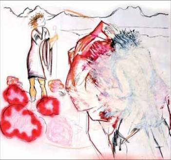 כאמור, עבודות שונות המוצגות בתערוכה מתחברות ישירות לסיפורי המקרא ולעיסוק הענֵף בהם באמנות הישראלית. לנדאו מגלה במרחב זה פנים חדשות, ומייצרת דימויים חדשים שמיתוספים למאגר האיקונוגרפי של האמנות היהודית: תצריב אקווטינטה משנת 2006 מציג לידה טראומתית של יולדת המתבוססת בדמיה, ומרפרר ישירות לפיסול האיקוני של מנשה קדישמן. צורה איקונוגרפית חדשה ומפתיעה של "הגר וישמעאל" – תמה נפוצה באמנות הישראלית ובאמנות הפלשתינית כאחד – מופיעה בהיפוך מהדימוי השכיח של האם הנושאת את קרבנה – כאן דווקא ישמעאל נושא את אמו.