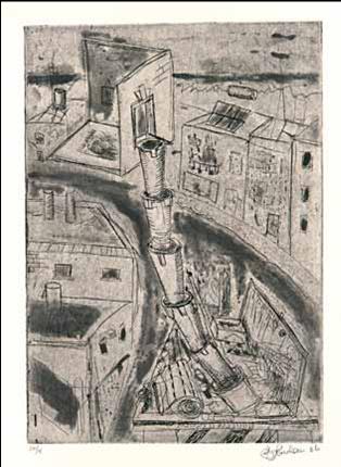 תחריט יפה המוצג בתערוכה מראה רחוב ובו דירה מרחפת באוויר שממנה יוצא צינור-מגלשה המשמש לפינוי חומרי בניין. העבודה הזאת מתחברת לאחד האובייקטים שהוצגו בתערוכה "חדר האוכל" (""The Dining Hall) שהוצגה בברלין (מכון לאמנות עכשווית, ברלין, 2007. אוצרת: גבריאל הורן) – היה זה פסל קטן עשוי עשרות יציקות קטנות של ברונזה ופליז ("בית יציקה (דיוקן)", 2007). המיצב נבנה כמודל של דירה שקרסה אל תוך צינור של מגלשה שמשמש לפינוי חומרי בניין. מעל הצינור נותרו שאריות החדר שקרס. מתחת לשאריות המבנה, בערימת פסולת הבניין שבמכולה, נערמו לצד מכונת כביסה, תנור ואמבטיה גם פריטים שנפסלו על-ידי בית-היציקה ליודאיקה "לנדאו" שבדרום תל-אביב, שם גם נוצרה העבודה.