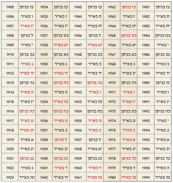 משבצת שמסומנת באדום מסמלת תאריך שחוזר כעבור 19 שנה. למשל: בשנת 1907 היה אחד במאי בתאריך יז באייר, וכך גם בשנת 1926. סקירה מהירה מלמדת כי מספר המשבצות האדומות  בטבלה בין השנים 1905 ו-1980, 76 שנה, הוא בסך הכול 33, כלומר – פחות מחצי.