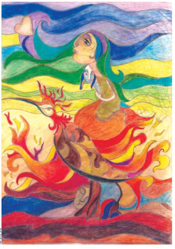 ובפתאום, רועשים השמים ומקדיר הירח ואוספים הכוכבים את אורם, ועל החדר עט דוכיפת גדול, בוער כולו. אש בכנפיו ובזנבו, אש ברגליו הקצרות, אש במקורו הדק והמחודד, ציצת הנוצות הארוכות שעל ראשו – להבות, והוא עף אנה ואנה, סחור סחור, במעגלים ובזינוקים. מפעם לפעם פוגעות כנפיו הפשוקות בכתלים ובפתחי האוויר ובתקרה, ואור גדול מסנוור בחדר.