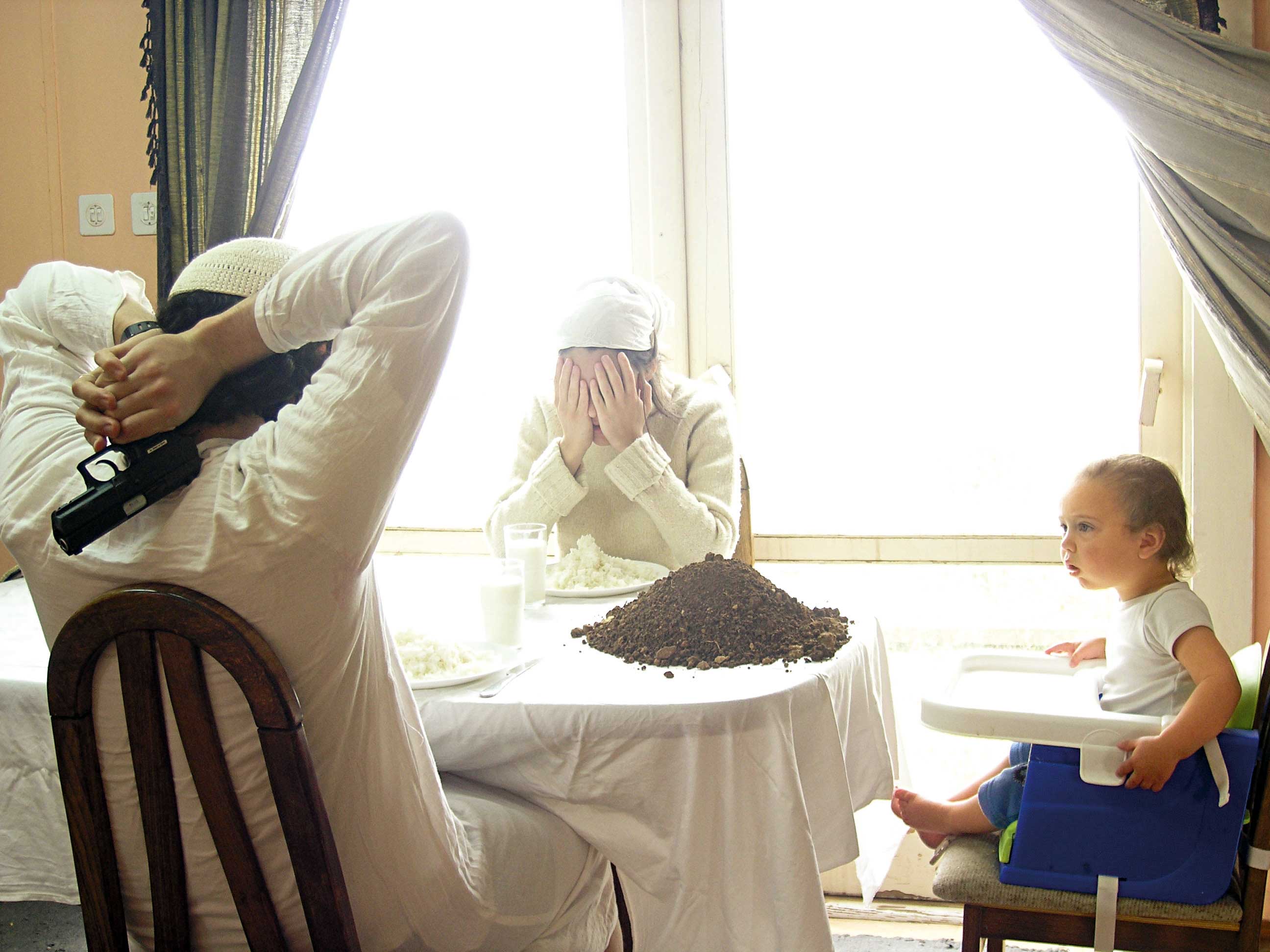 סלומון צילם את משפחתו, בביתו, והאקדח שלו. הצילום נעשה בתקופה מתוחה: זמן לא רב לפני כן נרצח שכנם ביישוב בת עין. ביצירה הוא מנסה לשאול על המציאות שבקיום הזה. "איזו מין גבריות יש במצב הזה, איזו מין אבהות, איזה מין שולחן שבת נוצר באווירה כזו, איזו מין רוחניות נוצרת בתוך מציאות של סיכון כזה".