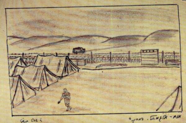 הכל קרה, הכל אמיתי. אום אלג'מאל, המחנה, תש"ט. קריקטורה מהשבי הירדני. צילום באדיבות הארכיון לתולדות גוש עציון