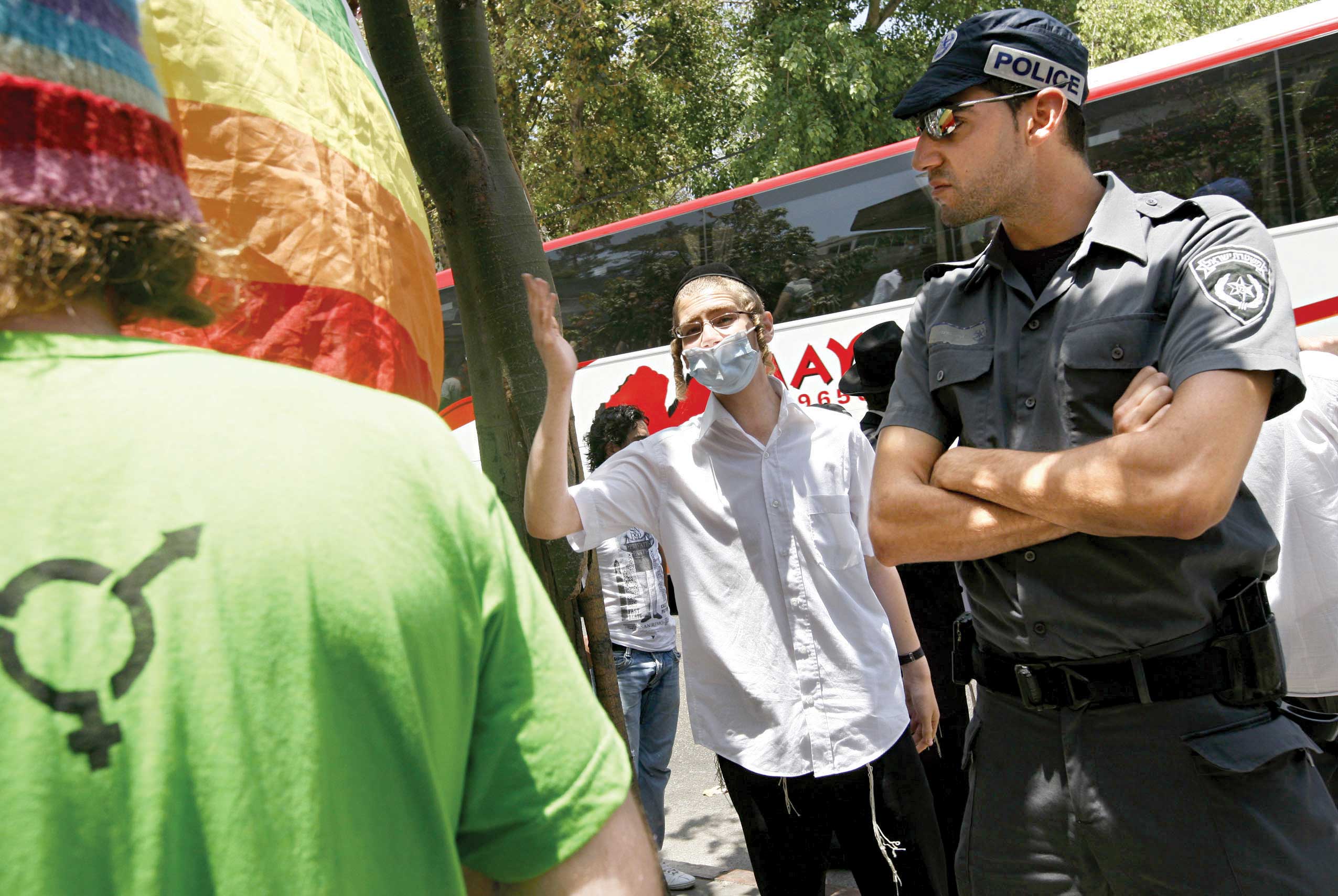 צעיר חרדי מתווכח עם משתתף במצעד הגאווה, תל אביב 2008  צילום: פלאש 90