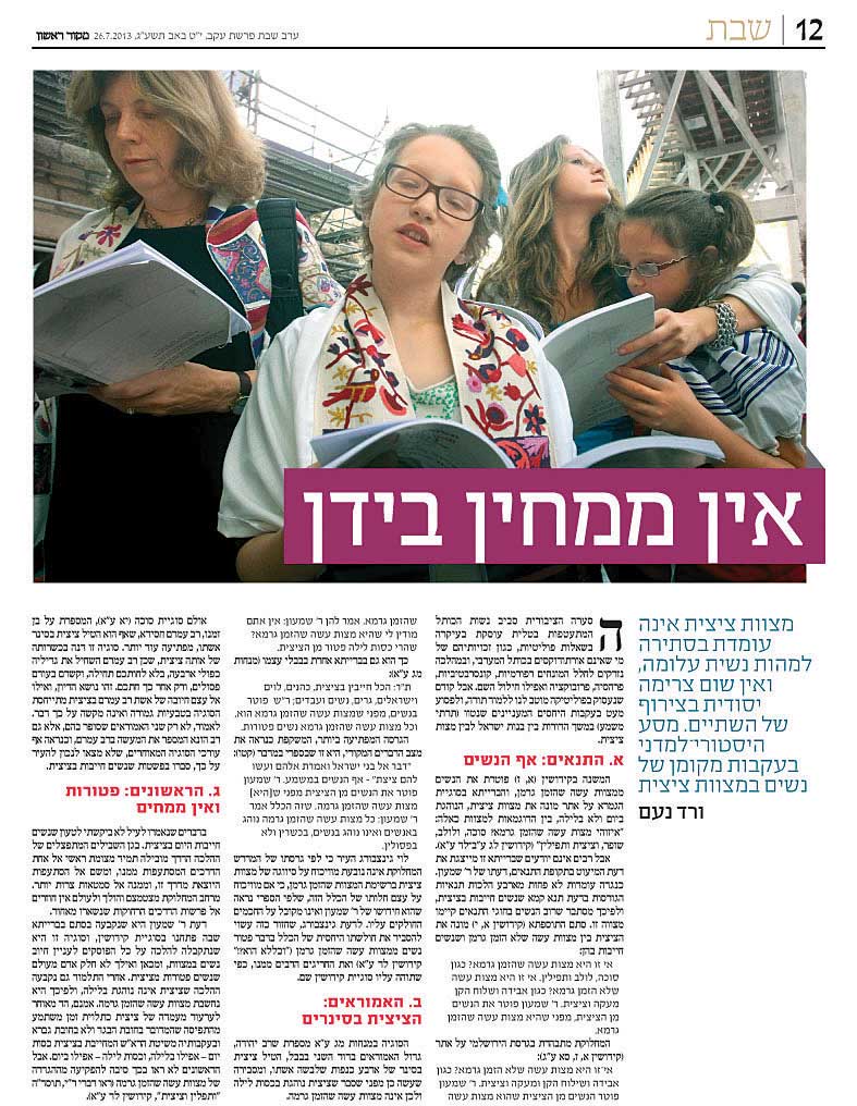 הנשקה טוען ש"נשים, שמצוות 'ועשו להם ציצית' אינה מוטלת עליהן, אינן זקוקות לציצית בקריאת הפרשה". ואני שואלת: אם יקבלו עליהן מצווה זו, מדוע לא יזדקקו לה? אמת דיבר, ש"ריח האתרוג, קול השופר וצל הסוכה מעולם לא נשללו מנשים". מניתי את אלה כדי לרמוז, כפי שכבר הוצע במחקר, שיסוד הרחקתן הראשונית של נשים ממצוות העשה האמורות אינו המאפיין המלאכותי של "הזמן גרמן", שאינו הולם באמת את הרשימה כולה, כי אם העובדה שמצוות אלה מגדירות ומאפיינות הן את החוויה הדתית הן את השייכות לציבור. עם הציבור נמנים רק גדולים בני חורין, ועל כן מצוות אלה מגדירות למעשה את מעמדו של אדם מישראל כבן חורין. אכן, עבד שהניח תפילין בפני רבו – יצא לחירות (כתובות כח, ב). הנשים יצאו לחירות כבר מזמן, וכשם שבעבר הרחוק תבעו וקיבלו שייכות בשופר ולולב, כך יזכו בע"ה גם בשאר העטרות של שייכות ושותפות בקהל ישראל.