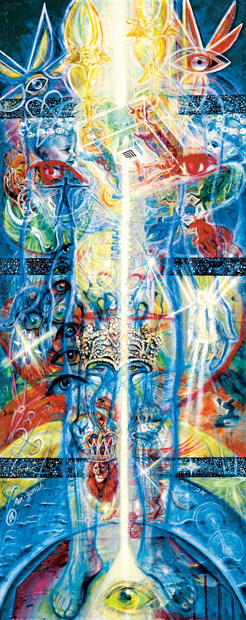 היצירה "עולם המלאכים" מורכבת מארבעה רבדים המסמלים את ארבעת העולמות בקבלה: אצילות, בריאה, יצירה ועשייה. דמות אדם סמויה ללא פנים במרכז התמונה מתגלה במישור נוסף, והיא מרמזת על תפיסת האדם העליון אשר כל נשמות ישראל כלולות בתוכו. ידיה הפשוטות מסמלות את קו ימין וקו שמאל שבשורש אילן הספירות הקבלי. התמונה מוצפנת כולה בסמלים המתכתבים עם השפה המודרניסטית העכשווית, דוגמת צבעוניות הקשת ושימוש באלמנטים צילומיים כהשראה לפני הכרובים למשל. למורכבות הזו נוסף נדבך נוסף באמצעות השיטה האנגליפית המאפשרת לראות ביצירה דיוקן גדול ממדים הרומז לפני השכינה, ואולי גם לפניה של האמנית.
