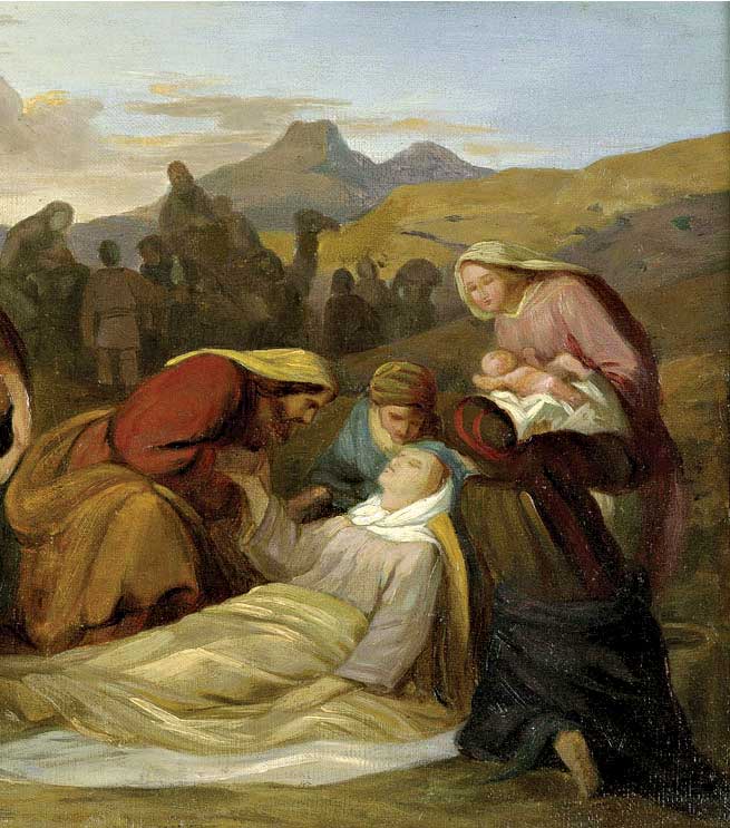 ב. רחל, אשתו האהובה של יעקב, כורעת ללדת בדרך למפגש עם הורי יעקב ומתה מסבלה בדרך, לא לפני שהיא מבטאת את ייסוריה בקריאת שם בן הזקונים של יעקב.