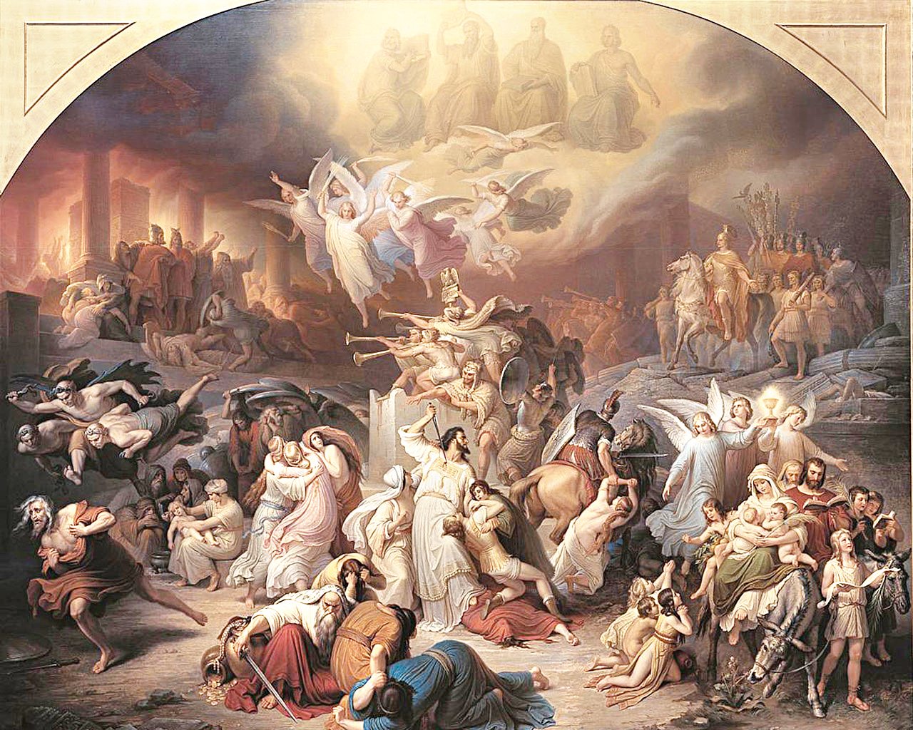 המסר הדתי הנוצרי מוצג באופן בוטה יותר ביצירה הענקית (7.05X5.85 מ‘) של הצייר הגרמני ווילהלם פון־קאולבך (1805־1874). זוהי יצירה דידקטית ותיאטרלית שאינה מתיימרת לתאר ריאליה היסטורית.