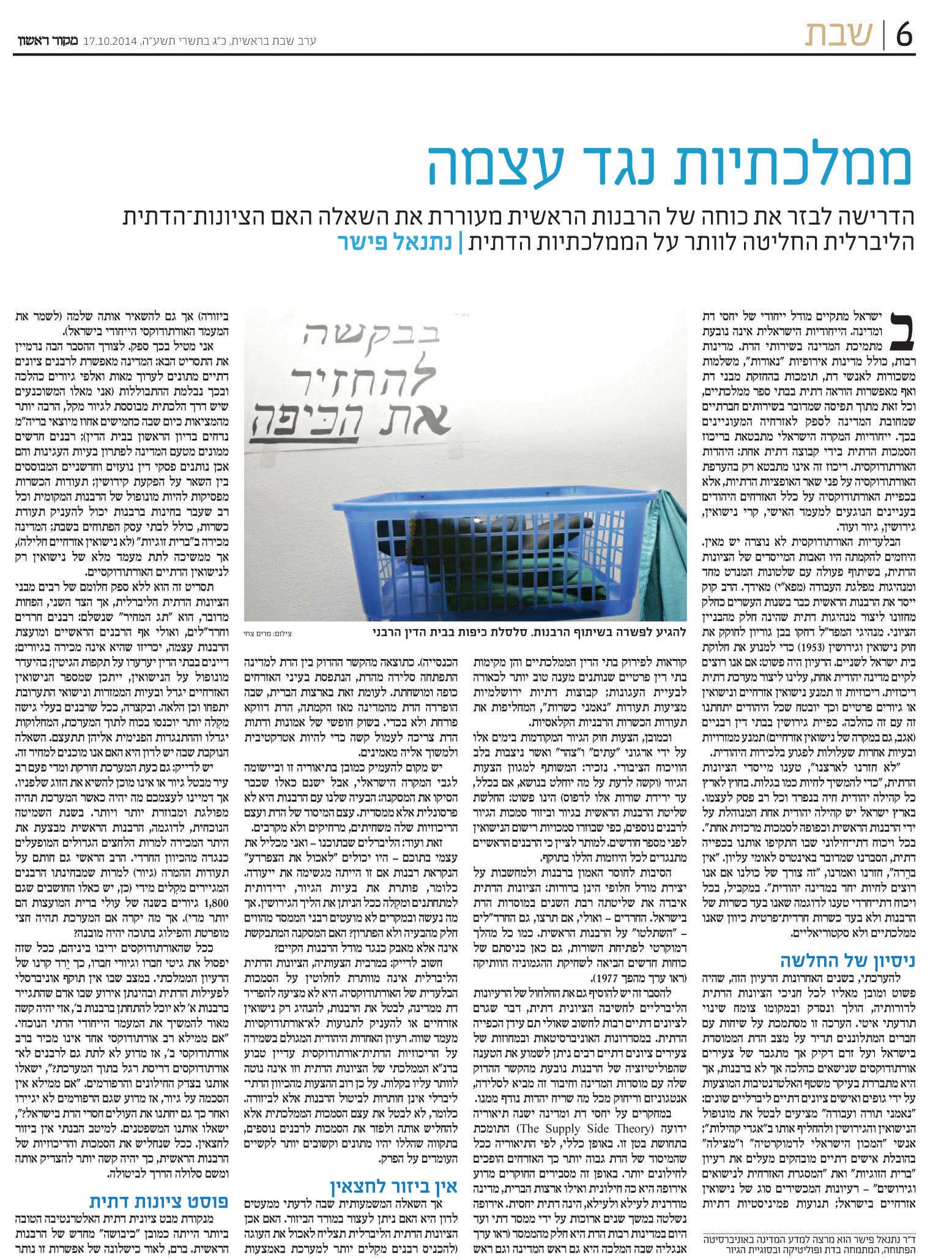 במאמרו מעמת נתנאל פישר את הציבור הדתי־לאומי־ליברלי עם ההשלכות של ביזור שירותי הדת – החל מהעלייה בהיקף הנישואין האזרחיים ועד להכרה בזרמים הלא אורתודוקסיים במדינת ישראל. פישר מצביע על כך שהפרטת שירותי הדת היא למעשה פוסט ציונות דתית, ושואל האם “הציונות הדתית עדיין מסוגלת למלא את תפקידה ההיסטורי… האם עדיף לפרק את השותפות המורכבת הזו כך שכל מגזר יפסוק לעצמו ולאנשי שלומו או שניתן להמשיך לשתף פעולה ולהילחם מבפנים על הדרוש תיקון?“.