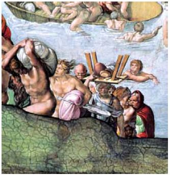 מיכלאנג'לו (1564־1475) החל את מפעלו המונומנטלי של ציור תקרת הקפלה הסיסטינית שבוותיקן בציור המבול (מיכלאנג'לו ותקרת האפיפיור, רוס קינג, עמ' 102־94). בציור גדול המידות מתאר האמן עשרות דמויות שגורלן נחרץ. במרכז התמונה (שלא מובא כאן מטעמי צניעות) מצויר אדם קשיש הנושא על כתפו גופת אדם צעיר, אולי בנו, ומנסה בכוחות אחרונים להימלט מהמים הגואים. בתמונה להלן, שהיא פרט קטן מתוך התיאור, נראית אישה המנסה לעלות ליבשה, תוך כדי שהיא מאזנת על ראשה שרפרף הפוך ועליו כיכרות לחם, כמה סירים וסכו"ם. לפניה מתוארים שני גברים שריריים הנושאים צרורות של בגדים ומחבת. כולם מנסים לשווא להציל את נפשותיהם ואת חפציהם הדלים. כמה חסרי תוחלת נראים החיים המקופלים בחפציהם של אלה שלא שרדו.