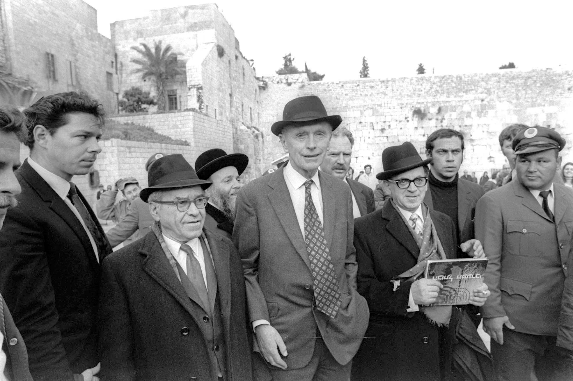 השר היחיד שתמיד היה הולך עם ספר. ורהפטיג (משמאל) בביקור בכותל עם השר הבריטי אלק דאגלס