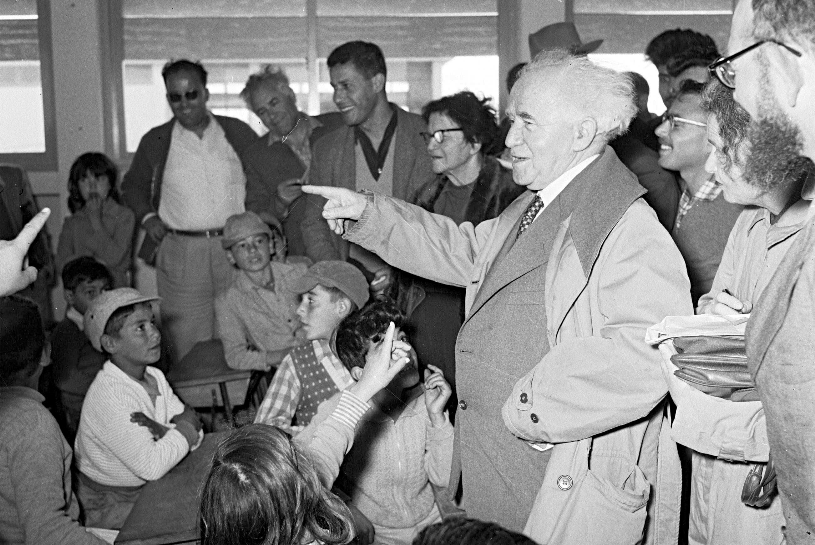 הפגישה האחרונה בין המנהיגים הסתיימה בהתנשאות מלגלגת מצדו. בן גוריון בביקור בבית ספר ממלכתי באשדוד ים צילום: משה פרידן, לע״מ