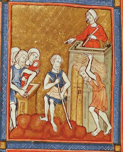 הסצנה הבאה נפוצה בהגדות הספרדיות ומתארת חלוקת מצה וחרוסת בערב פסח. ייתכן שמבצע זה של "קמחא דפסחא" היה נהוג כחלק מדאגת הקהילה לענייה. בהגדה מיוחדת זו לכל פרט יש משמעות סמלית. בעל הבית יושב בתוך קתדרה הנראית ככס מלכות. תיאור זה היה שמור באיורים הקודמים לפרעה, אך כאן מסמל האיור את העובדה שכעת, במאה ה־14, פרעה וגזרותיו הם נחלת העבר ואילו היהודים הם "בני מלכים".
