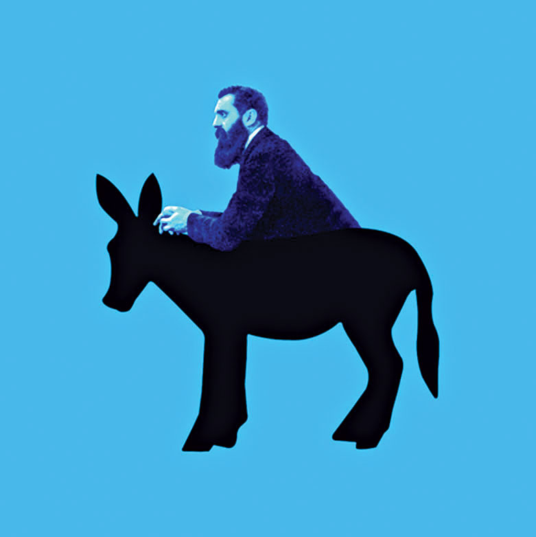 בעבודה "המרפסת של הרצל" הופכים הרצל והחמור ליצור היברידי. הם נראים כיצור אחד, עד כי נוצרת אשליה כאילו זהו הצילום המקורי של חוזה המדינה היהודית. כביכול צולם הרצל על חמורו, ולא כשהוא נשען על מעקה המרפסת בבאזל. המדיום הגרפי השטוח שבו השתמש האמן נוטל חיות מהיצירה. הרצל והחמור מקבלים ביצירה זו פרשנות איקונית ואוניברסלית. דמותו של הרצל מתמזגת עם דמות החמור הסכמטית ומעלה אסוציאציות מורכבות.