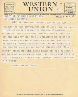 מברק של הרב י"ד סולוביצ'יק לשוורץ