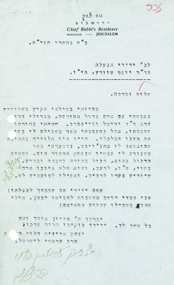 מכתב בכתב ידו של הרב יצחק הרצוג לד"ר יוסף שוורץ
