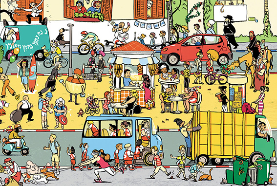 "זו המון עבודה. עבדתי על הספר במשך כמה חודשים טובים. מתחילים בכתיבה, כמו בספר רגיל. כותבים את הסיפורים, בוחרים את המקומות שבהם יתרחש הספר, את הדמויות שייצגו את כל גוני המרקם הישראלי. קצת כמו במאי, הייתי צריכה ללהק דמויות, להלביש אותן, לעשות סיור לוקיישן. נסעתי למקומות שאותם איירתי כי הבנתי שחיפוש בגוגל לא יספיק. כדי להעביר אווירה של מקום צריך להיות בו, לראות את סוגי האנשים, את הצמחייה ואת הצבעוניות. אז נסעתי ברחבי הארץ כמו תיירת. לכותל, לשוק מחנה יהודה. רשמתי טיפוסים ואירועים שקרו סביבי.