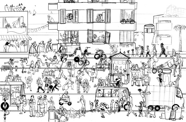 "נסעתי ברחבי הארץ כמו תיירת, ורשמתי טיפוסים ואירועים שקרו סביבי". פרט צבוע וסקיצה, תל אביב, מתוך "רק בישראל"