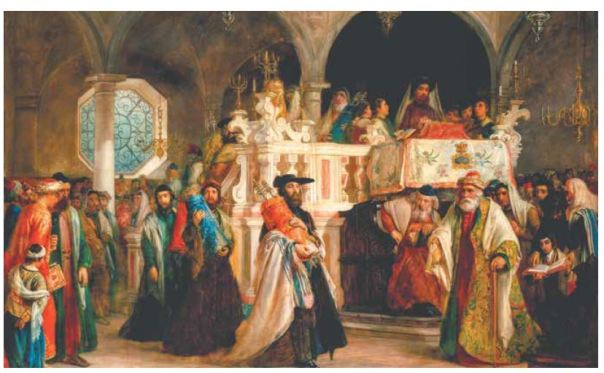 ספר התורה עומד במרכז. שמחת תורה בבית הכנסת בלגהורן (ליבורנו), איטליה, סולומון הארט, 1850