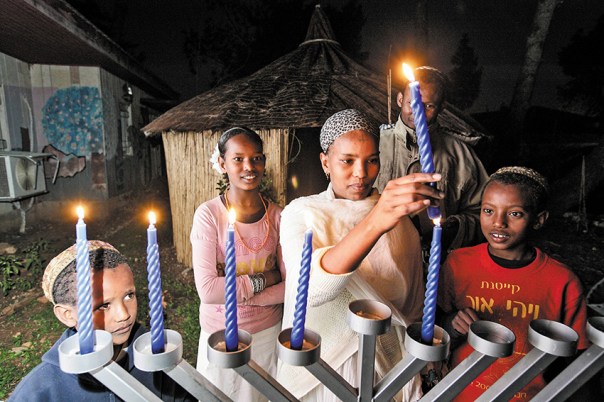 האם יהדות יכולה להתקיים בהיותה מנותקת במשך אלפי שנים? משפחה מביתא ישראל מדליקה נרות חנוכה בבית אתיופי מסורתי במרכז הקליטה במבשרת ציון, 2009