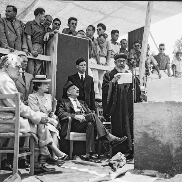 לאחר ההצבעה באו"ם בירך "שהחיינו" בשם ובמלכות. הרב עוזיאל בטקס הנחת אבן הפינה למכון ויצמן ברחובות, 1946 . משמאלו: פרופ' חיים ויצמן